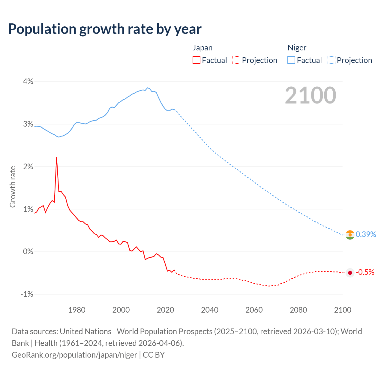 - For the last 10 years, Japan has had an average growth rate of -0.25% per year vs +3.5% in Niger.