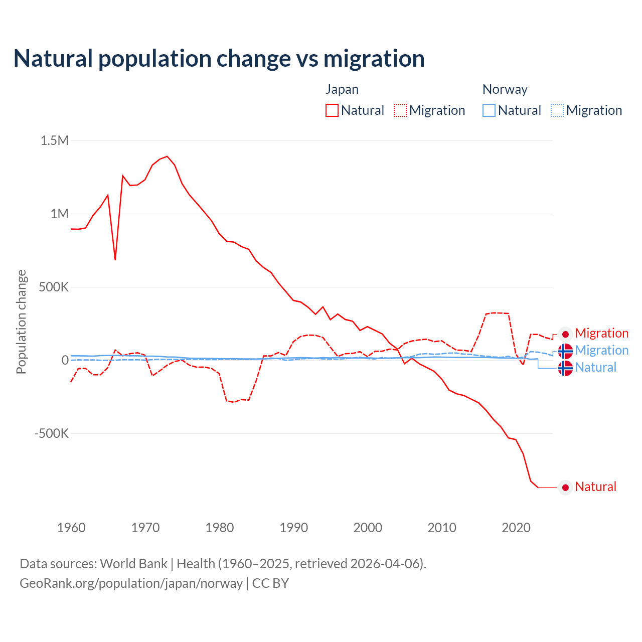 Over the last 10 years, 73.6% of the population change in Japan is from natural causes (a loss of 5,178,838 people) and 26.4% is from migration (a gain of 1,860,103 people). In Norway 31.3% is from natural causes (a gain of 138,699 people) and 68.7% is from migration (a gain of 303,945 people).