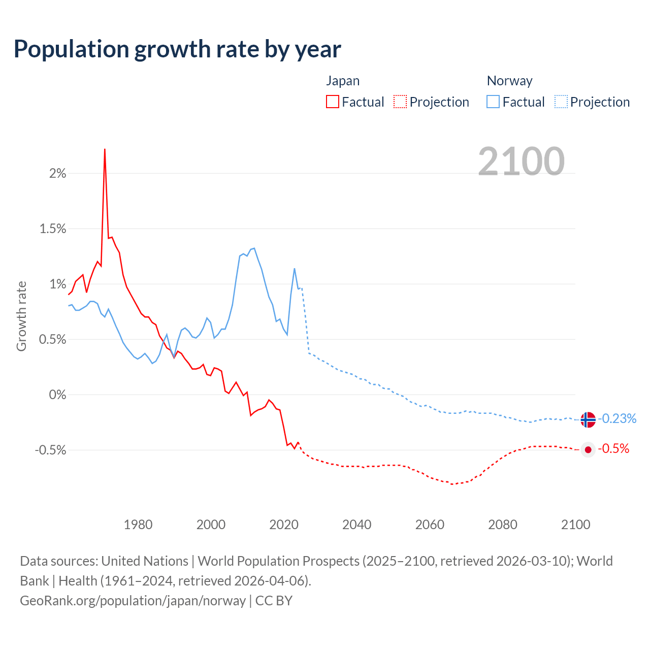 - For the last 10 years, Japan has had an average growth rate of -0.25% per year vs +0.85% in Norway.