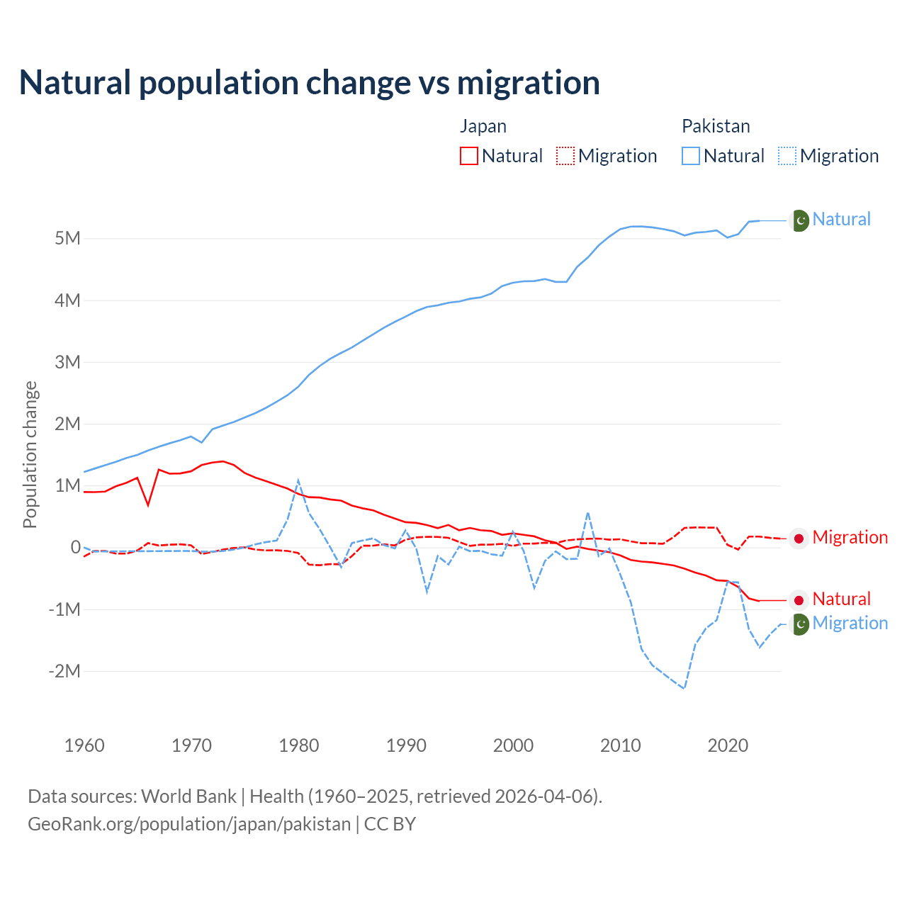 Over the last 10 years, 73.6% of the population change in Japan is from natural causes (a loss of 5,178,838 people) and 26.4% is from migration (a gain of 1,860,103 people). In Pakistan 77.8% is from natural causes (a gain of 51,255,404 people) and 22.2% is from migration (a loss of 14,629,055 people).