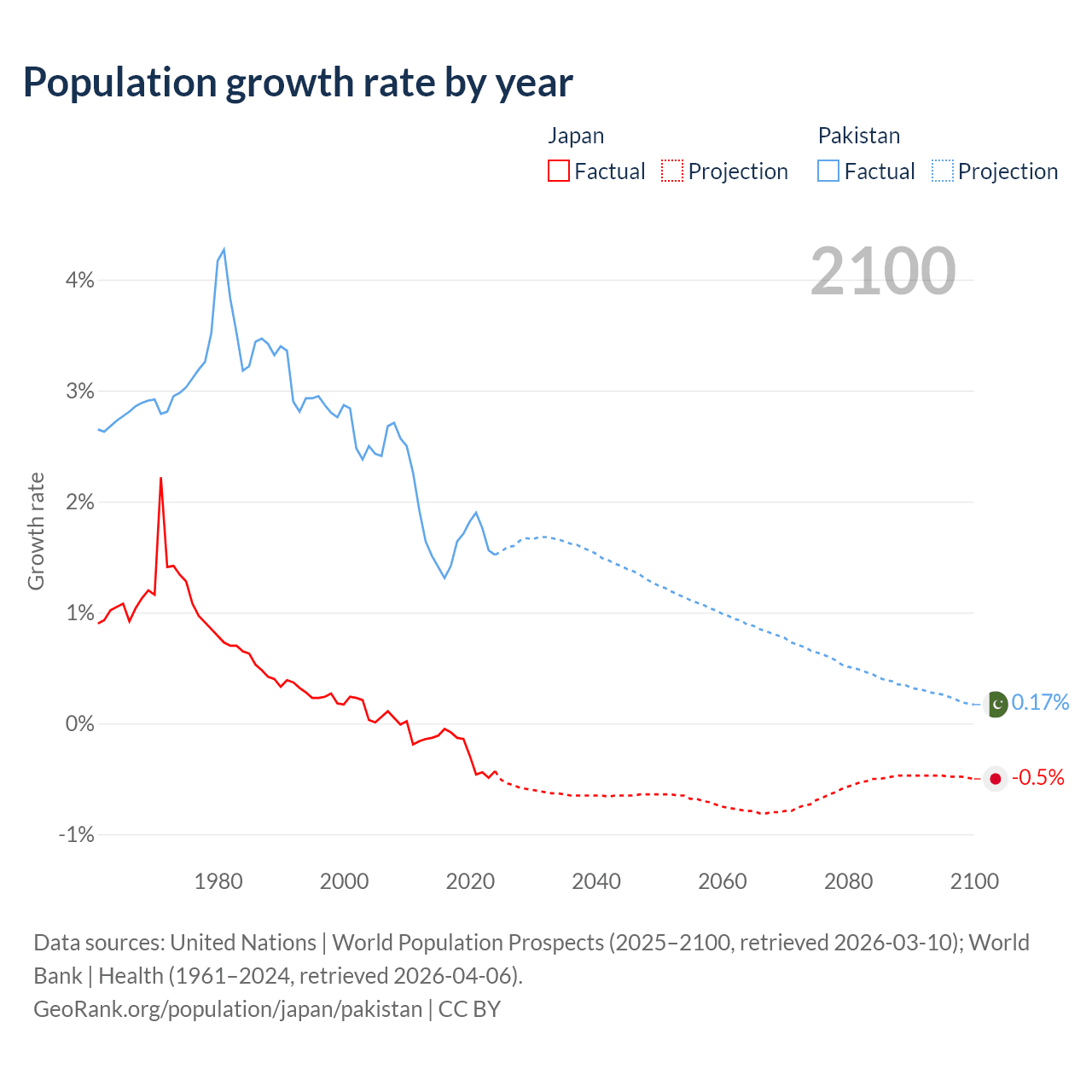- For the last 10 years, Japan has had an average growth rate of -0.25% per year vs +1.6% in Pakistan.