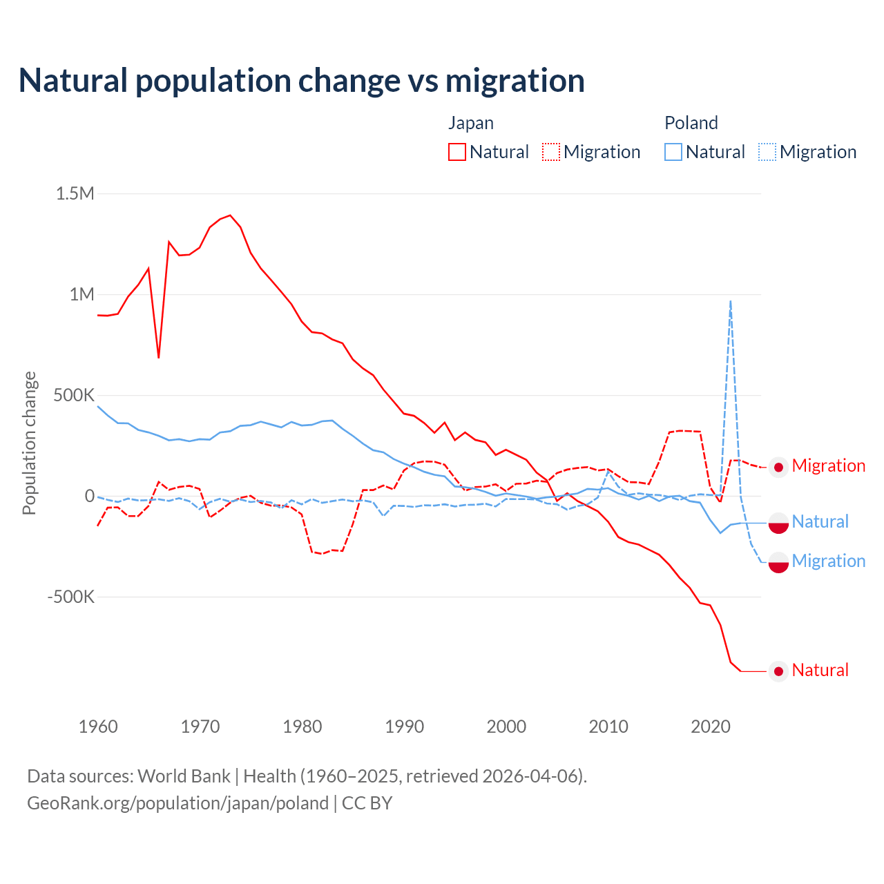 Over the last 10 years, 73.6% of the population change in Japan is from natural causes (a loss of 5,178,838 people) and 26.4% is from migration (a gain of 1,860,103 people). In Poland 41.4% is from natural causes (a loss of 675,443 people) and 58.6% is from migration (a gain of 955,766 people).