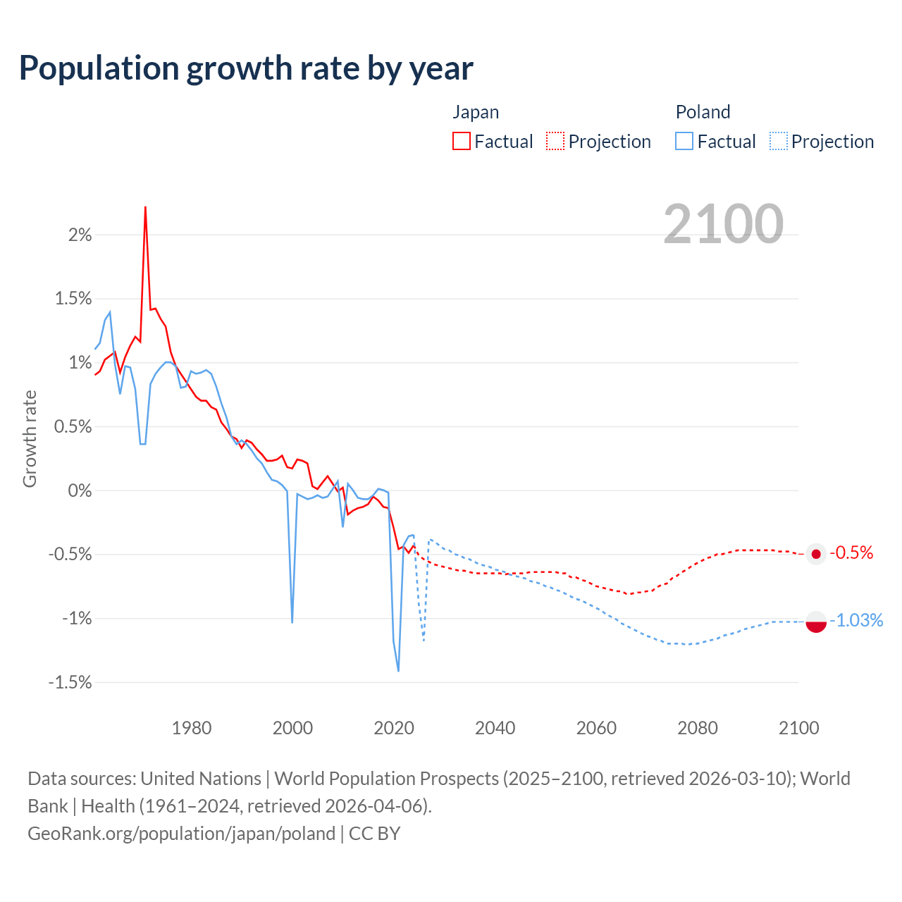 - For the last 10 years, Japan has had an average growth rate of -0.25% per year vs -0.36% in Poland.
