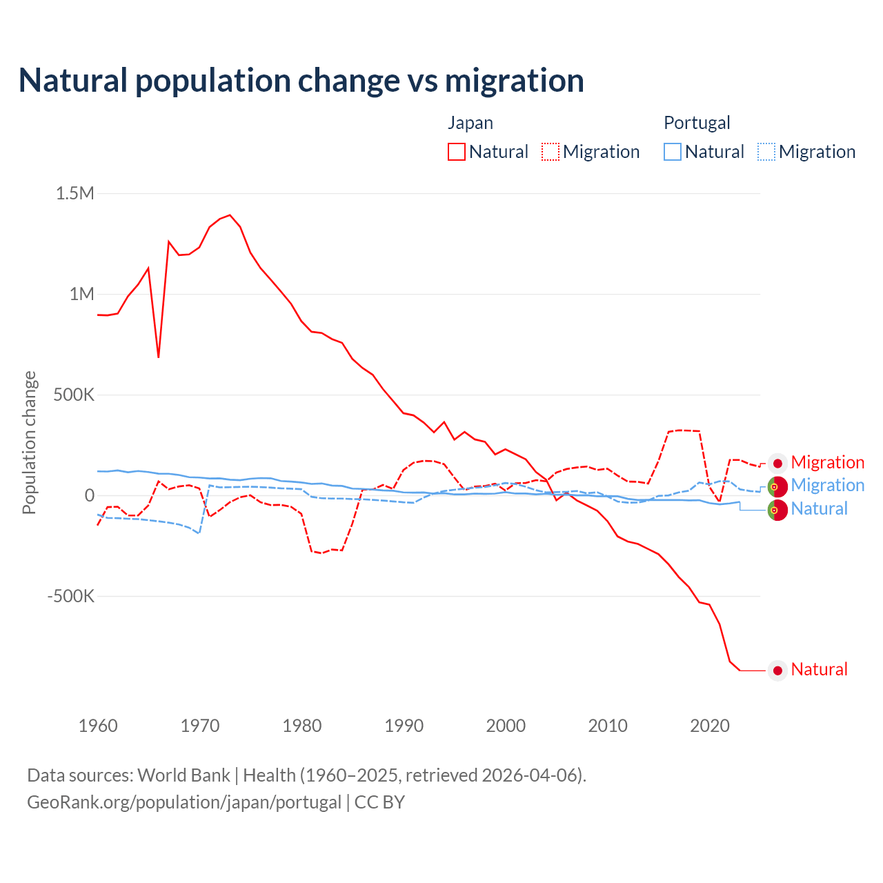 Over the last 10 years, 73.6% of the population change in Japan is from natural causes (a loss of 5,178,838 people) and 26.4% is from migration (a gain of 1,860,103 people). In Portugal 51% is from natural causes (a loss of 302,748 people) and 49% is from migration (a gain of 290,554 people).