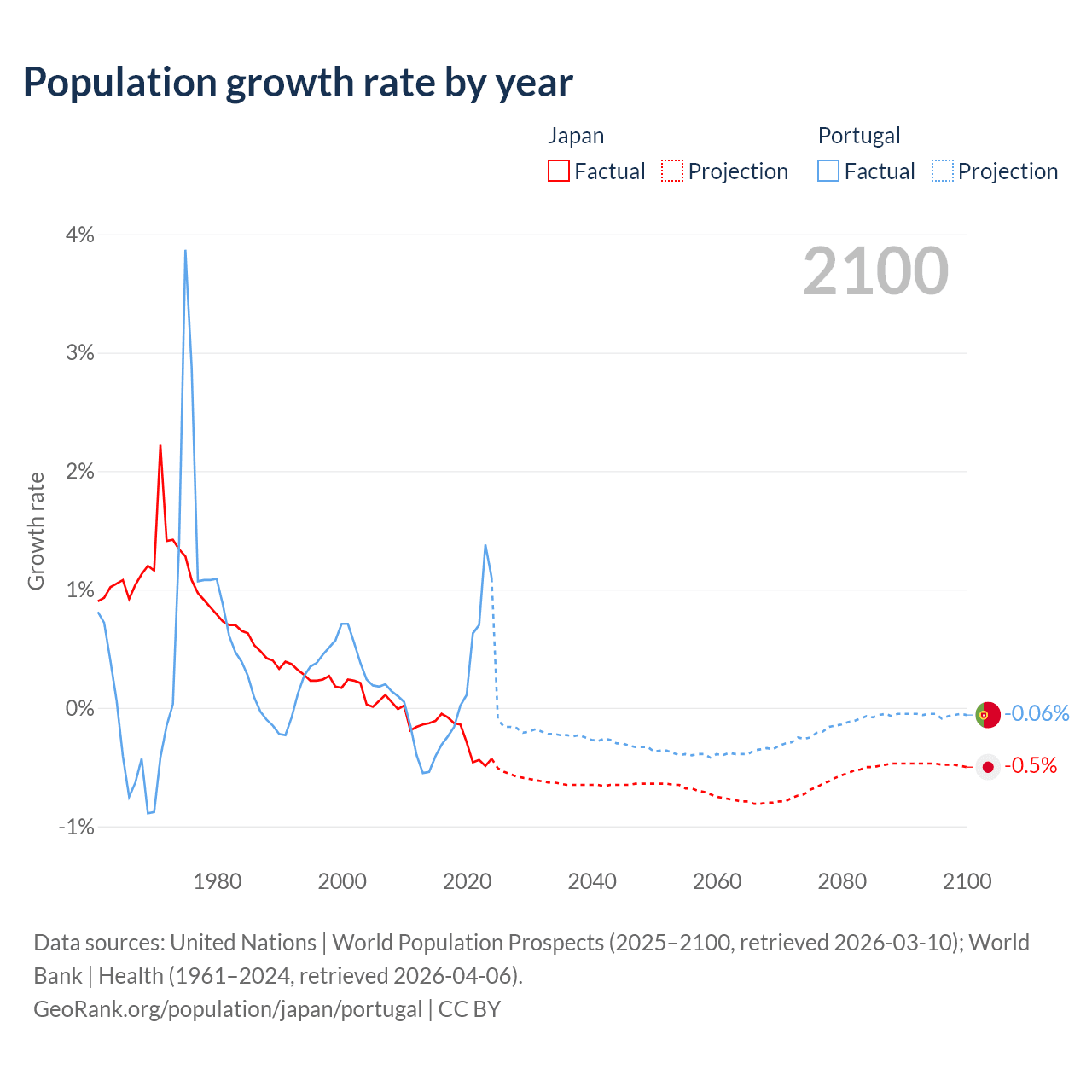 - For the last 10 years, Japan has had an average growth rate of -0.25% per year vs +0.21% in Portugal.