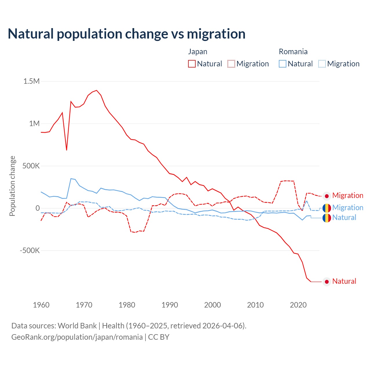 Over the last 10 years, 73.6% of the population change in Japan is from natural causes (a loss of 5,178,838 people) and 26.4% is from migration (a gain of 1,860,103 people). In Romania 82% is from natural causes (a loss of 766,295 people) and 18% is from migration (a loss of 167,917 people).