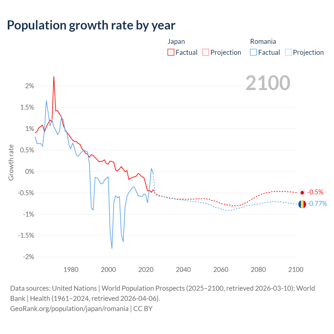 - For the last 10 years, Japan has had an average growth rate of -0.25% per year vs -0.43% in Romania.