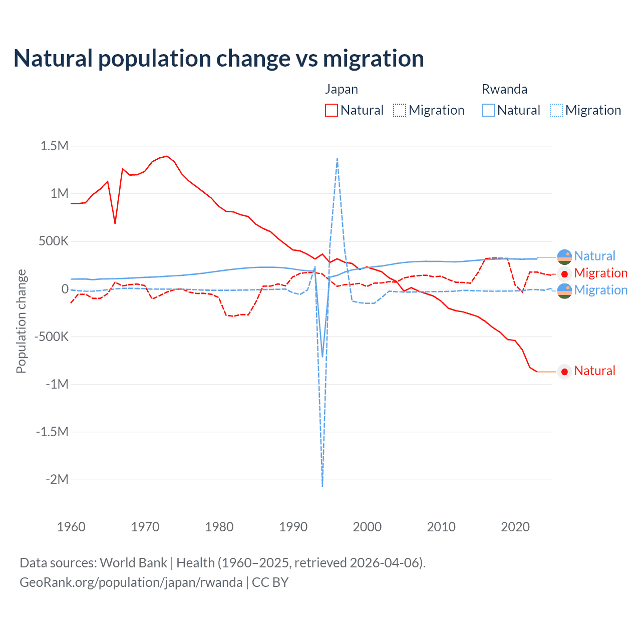Over the last 10 years, 73.6% of the population change in Japan is from natural causes (a loss of 5,178,838 people) and 26.4% is from migration (a gain of 1,860,103 people). In Rwanda 93.8% is from natural causes (a gain of 3,081,296 people) and 6.18% is from migration (a loss of 203,035 people).