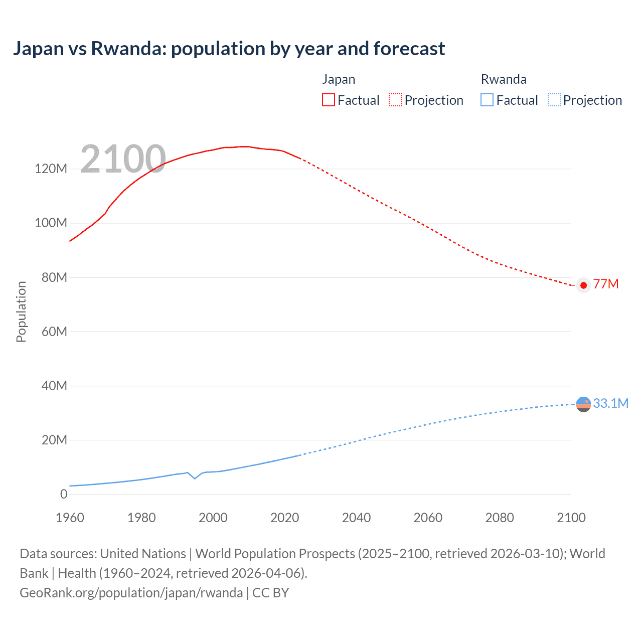 The latest officially reported population of Japan was 123,975,371 in 2024 vs 14,256,567 people in Rwanda in 2024. In 2026, based on the adjusted UN estimation, the current Japan's population is 122,677,250 people compared to 14,975,051 in Rwanda.