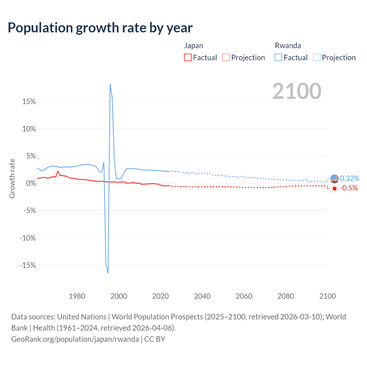 - For the last 10 years, Japan has had an average growth rate of -0.25% per year vs +2.31% in Rwanda.