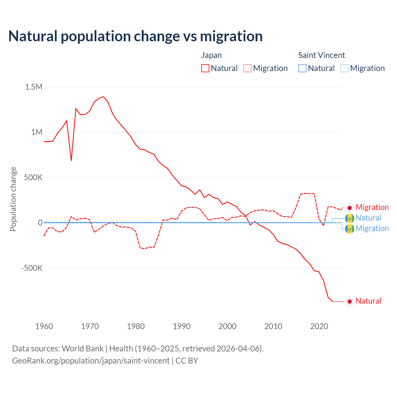 Over the last 10 years, 73.6% of the population change in Japan is from natural causes (a loss of 5,178,838 people) and 26.4% is from migration (a gain of 1,860,103 people). In Saint Vincent 21.2% is from natural causes (a gain of 2,525 people) and 78.8% is from migration (a loss of 9,393 people).