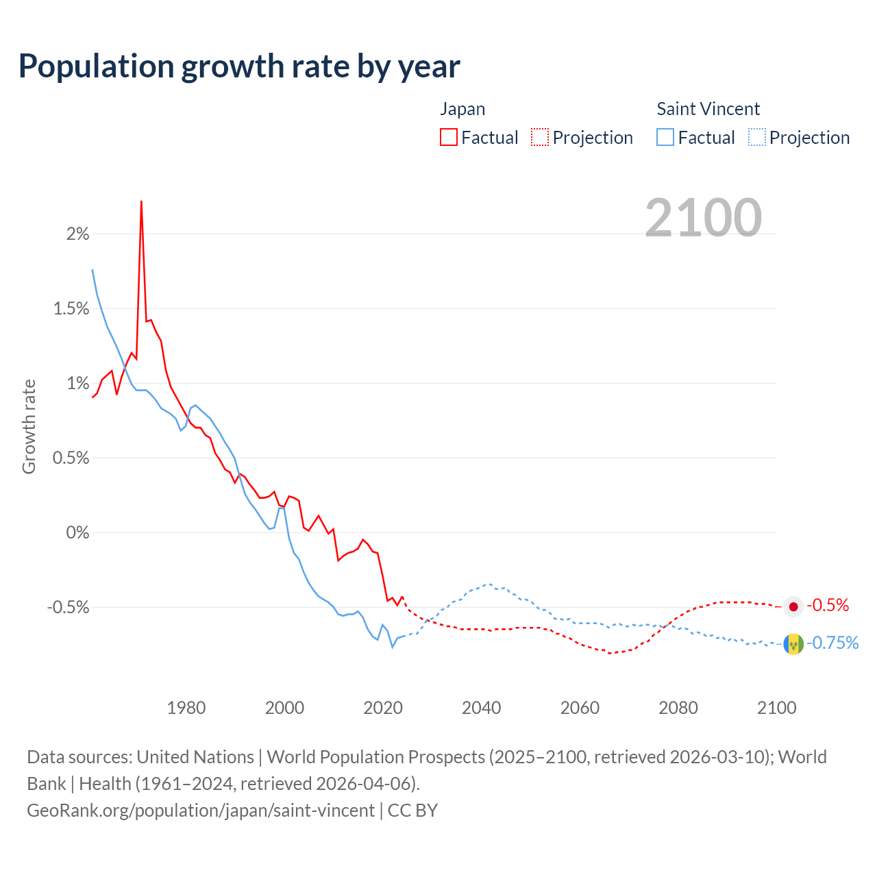- For the last 10 years, Japan has had an average growth rate of -0.25% per year vs -0.65% in Saint Vincent.