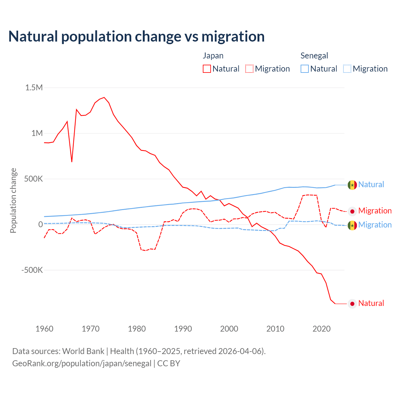 Over the last 10 years, 73.6% of the population change in Japan is from natural causes (a loss of 5,178,838 people) and 26.4% is from migration (a gain of 1,860,103 people). In Senegal 93.9% is from natural causes (a gain of 4,089,205 people) and 6.13% is from migration (a gain of 267,266 people).