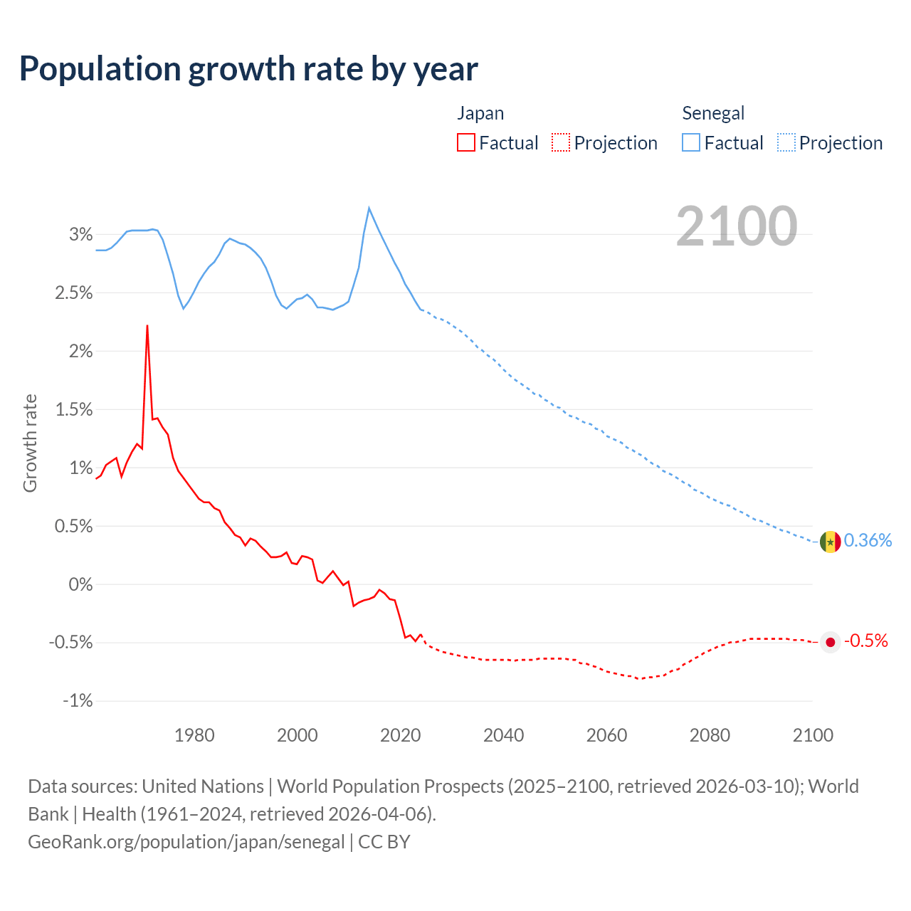 - For the last 10 years, Japan has had an average growth rate of -0.25% per year vs +2.76% in Senegal.