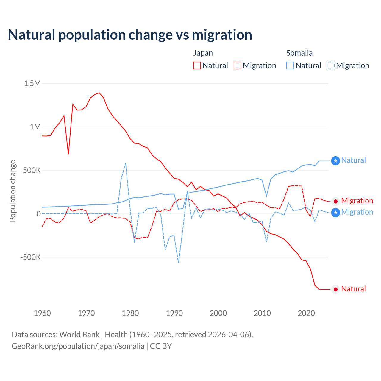 Over the last 10 years, 73.6% of the population change in Japan is from natural causes (a loss of 5,178,838 people) and 26.4% is from migration (a gain of 1,860,103 people). In Somalia 94.4% is from natural causes (a gain of 5,270,105 people) and 5.58% is from migration (a gain of 311,487 people).