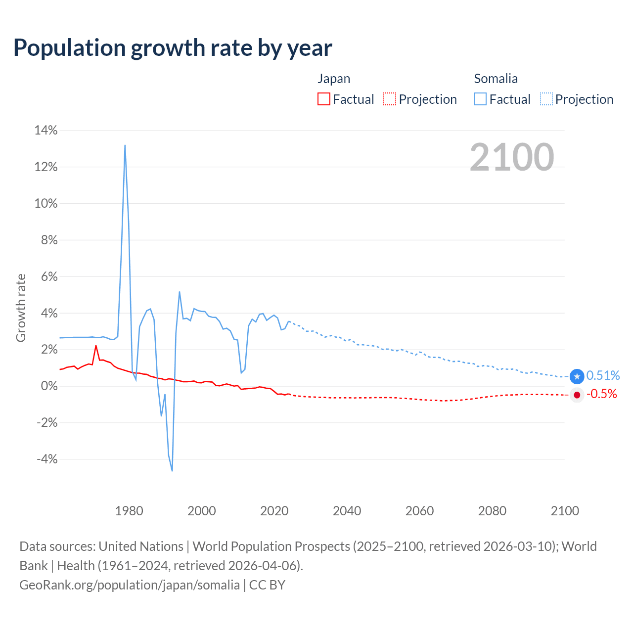 - For the last 10 years, Japan has had an average growth rate of -0.25% per year vs +3.61% in Somalia.