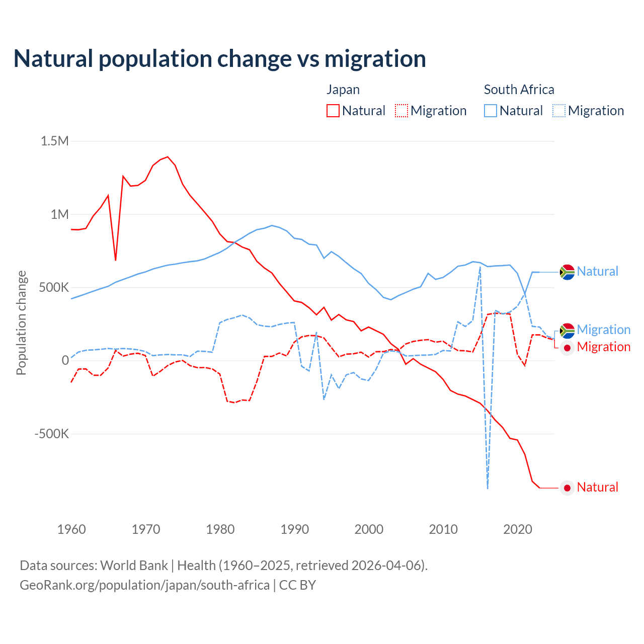 Over the last 10 years, 73.6% of the population change in Japan is from natural causes (a loss of 5,178,838 people) and 26.4% is from migration (a gain of 1,860,103 people). In South Africa 72.8% is from natural causes (a gain of 6,190,027 people) and 27.2% is from migration (a gain of 2,316,795 people).
