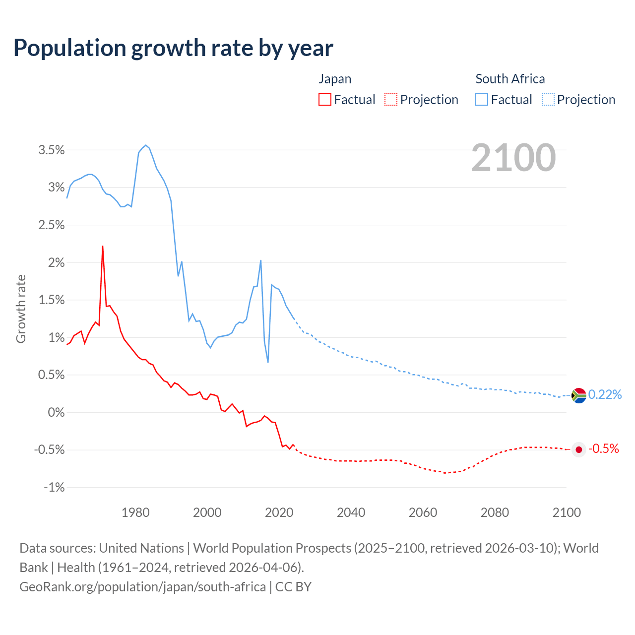 - For the last 10 years, Japan has had an average growth rate of -0.25% per year vs +1.44% in South Africa.