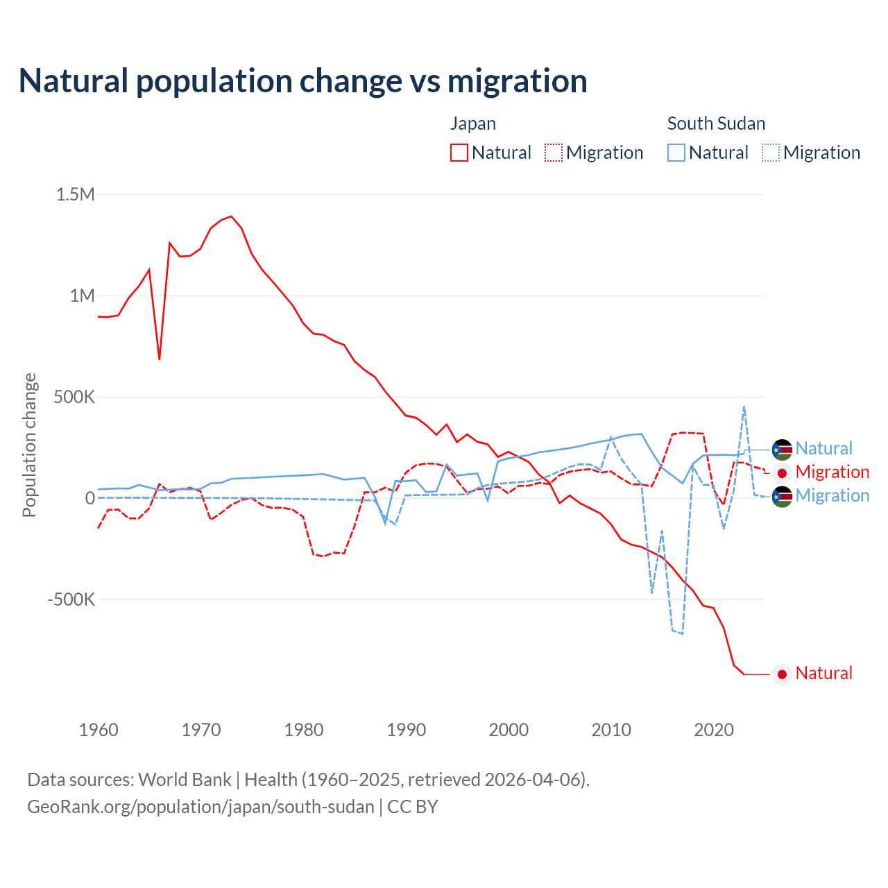 Over the last 10 years, 73.6% of the population change in Japan is from natural causes (a loss of 5,178,838 people) and 26.4% is from migration (a gain of 1,860,103 people). In South Sudan 57.4% is from natural causes (a gain of 1,792,135 people) and 42.6% is from migration (a loss of 1,329,606 people).