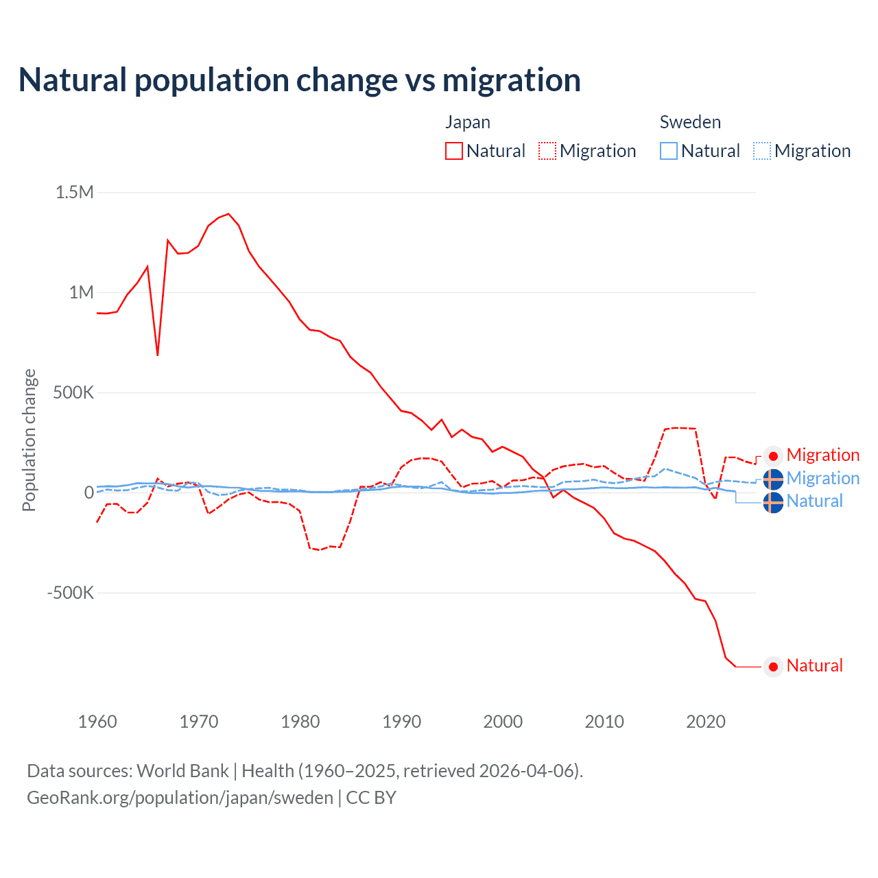 Over the last 10 years, 73.6% of the population change in Japan is from natural causes (a loss of 5,178,838 people) and 26.4% is from migration (a gain of 1,860,103 people). In Sweden 21.4% is from natural causes (a gain of 201,900 people) and 78.6% is from migration (a gain of 743,642 people).