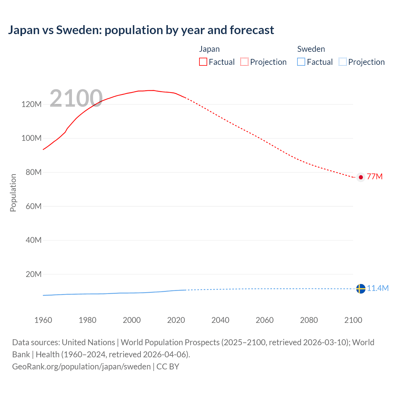 Japan vs Sweden: population by year and forecast