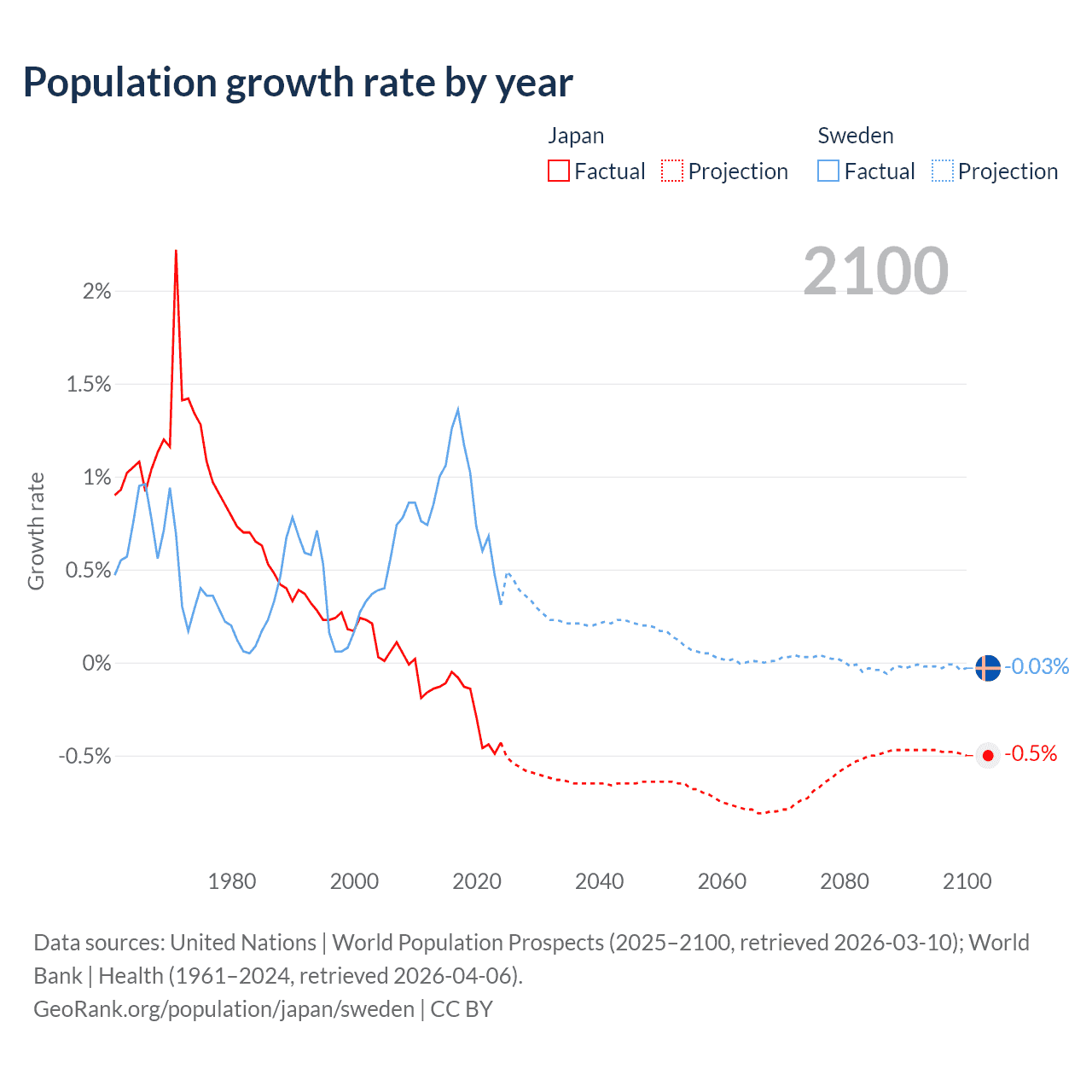 - For the last 10 years, Japan has had an average growth rate of -0.25% per year vs +0.88% in Sweden.