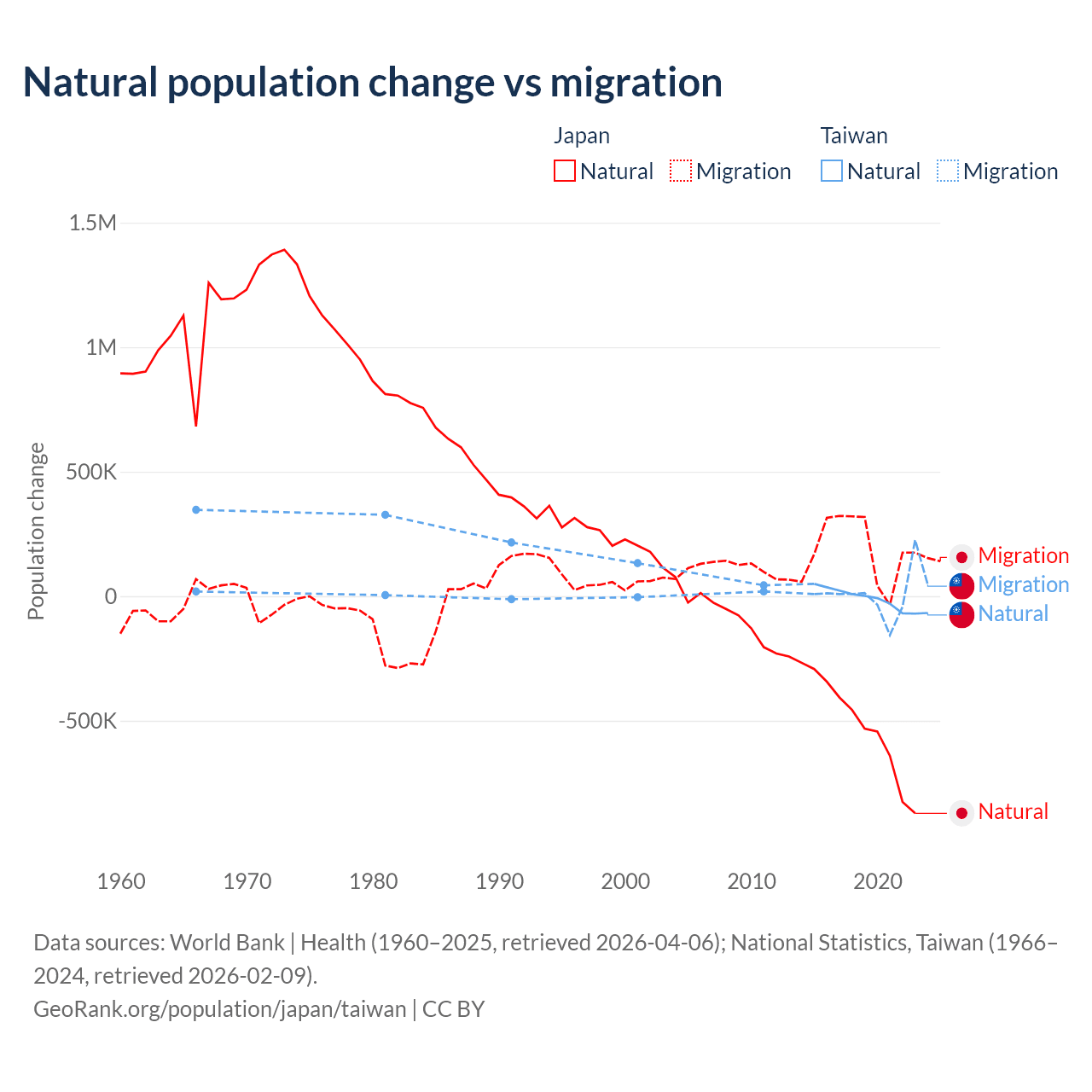 Over the last 10 years, 73.6% of the population change in Japan is from natural causes (a loss of 5,178,838 people) and 26.4% is from migration (a gain of 1,860,103 people). In Taiwan 56.7% is from natural causes (a loss of 57,467 people) and 43.3% is from migration (a gain of 43,884 people).