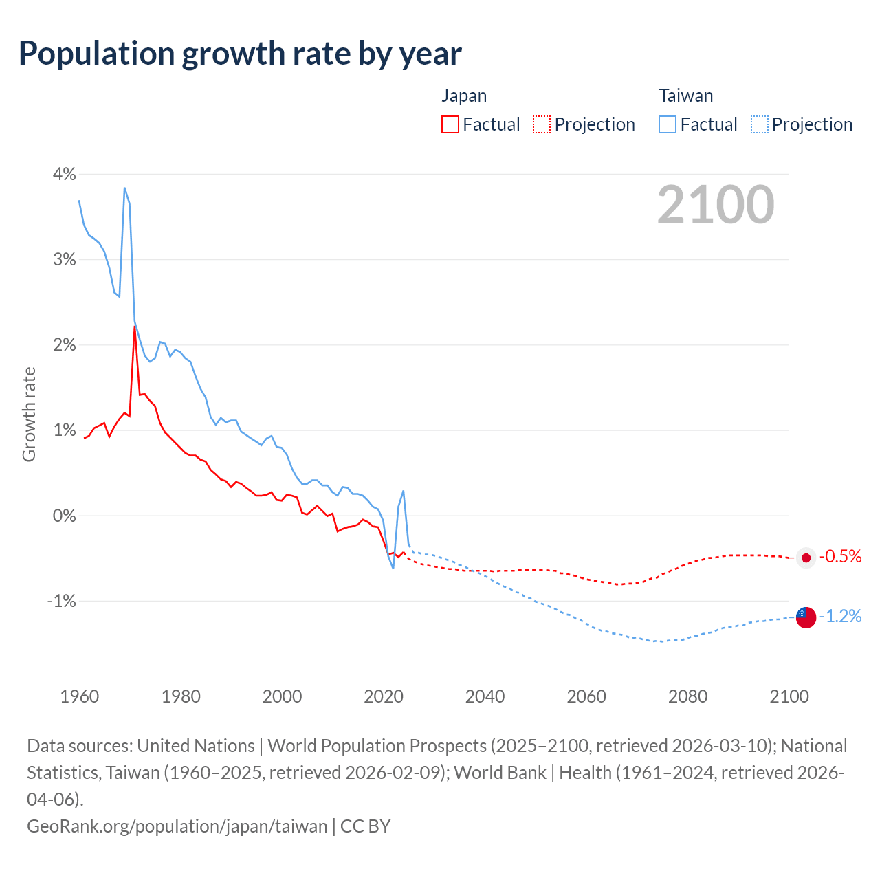 Data sources: World Bank | Health (1960–2024, retrieved 2026-04-06); United Nations | World Population Prospects (1960–2026, retrieved 2026-03-10); U.S. Census Bureau (1960–2025, retrieved 2026-02-08); National Statistics, Taiwan (1960–2025, retrieved 2026-02-09); Central Intelligence Agency (CIA) (2000–2019, retrieved 2026-02-20).