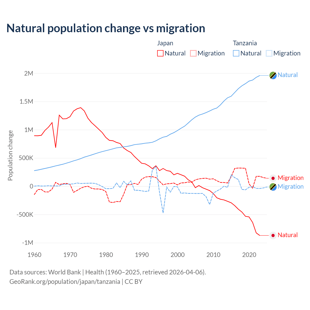 Over the last 10 years, 73.6% of the population change in Japan is from natural causes (a loss of 5,178,838 people) and 26.4% is from migration (a gain of 1,860,103 people). In Tanzania 98.7% is from natural causes (a gain of 17,769,541 people) and 1.27% is from migration (a gain of 229,466 people).