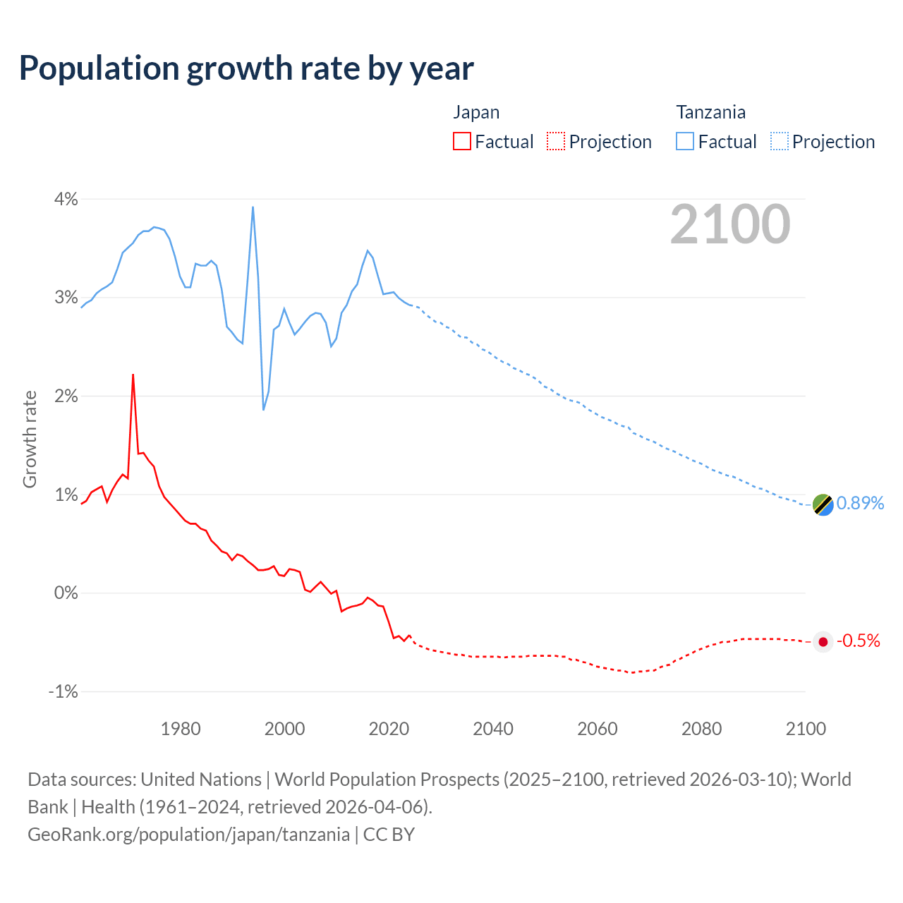 - For the last 10 years, Japan has had an average growth rate of -0.25% per year vs +3.13% in Tanzania.