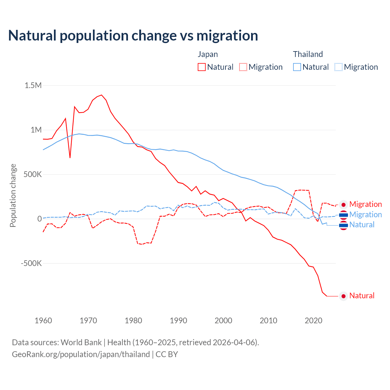 Over the last 10 years, 73.6% of the population change in Japan is from natural causes (a loss of 5,178,838 people) and 26.4% is from migration (a gain of 1,860,103 people). In Thailand 78.4% is from natural causes (a gain of 1,292,528 people) and 21.6% is from migration (a gain of 355,361 people).