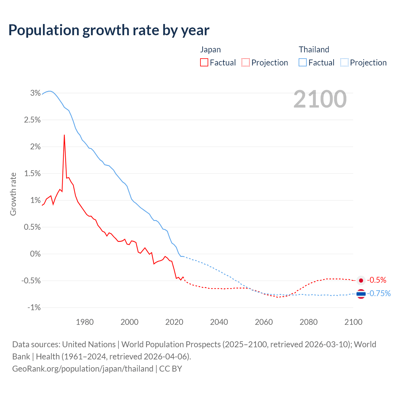 - For the last 10 years, Japan has had an average growth rate of -0.25% per year vs +0.23% in Thailand.