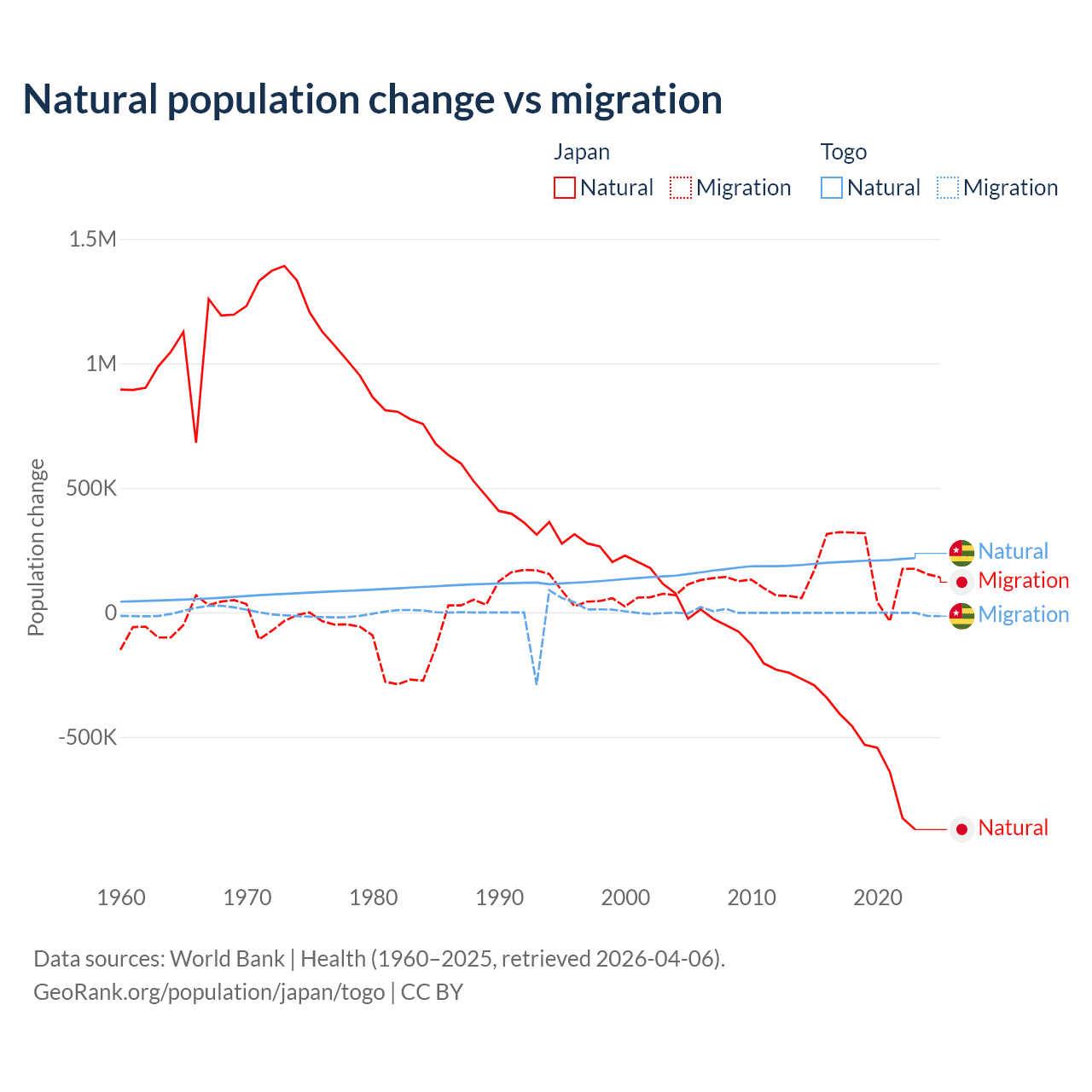 Over the last 10 years, 73.6% of the population change in Japan is from natural causes (a loss of 5,178,838 people) and 26.4% is from migration (a gain of 1,860,103 people). In Togo 99.1% is from natural causes (a gain of 2,052,115 people) and 0.86% is from migration (a loss of 17,852 people).
