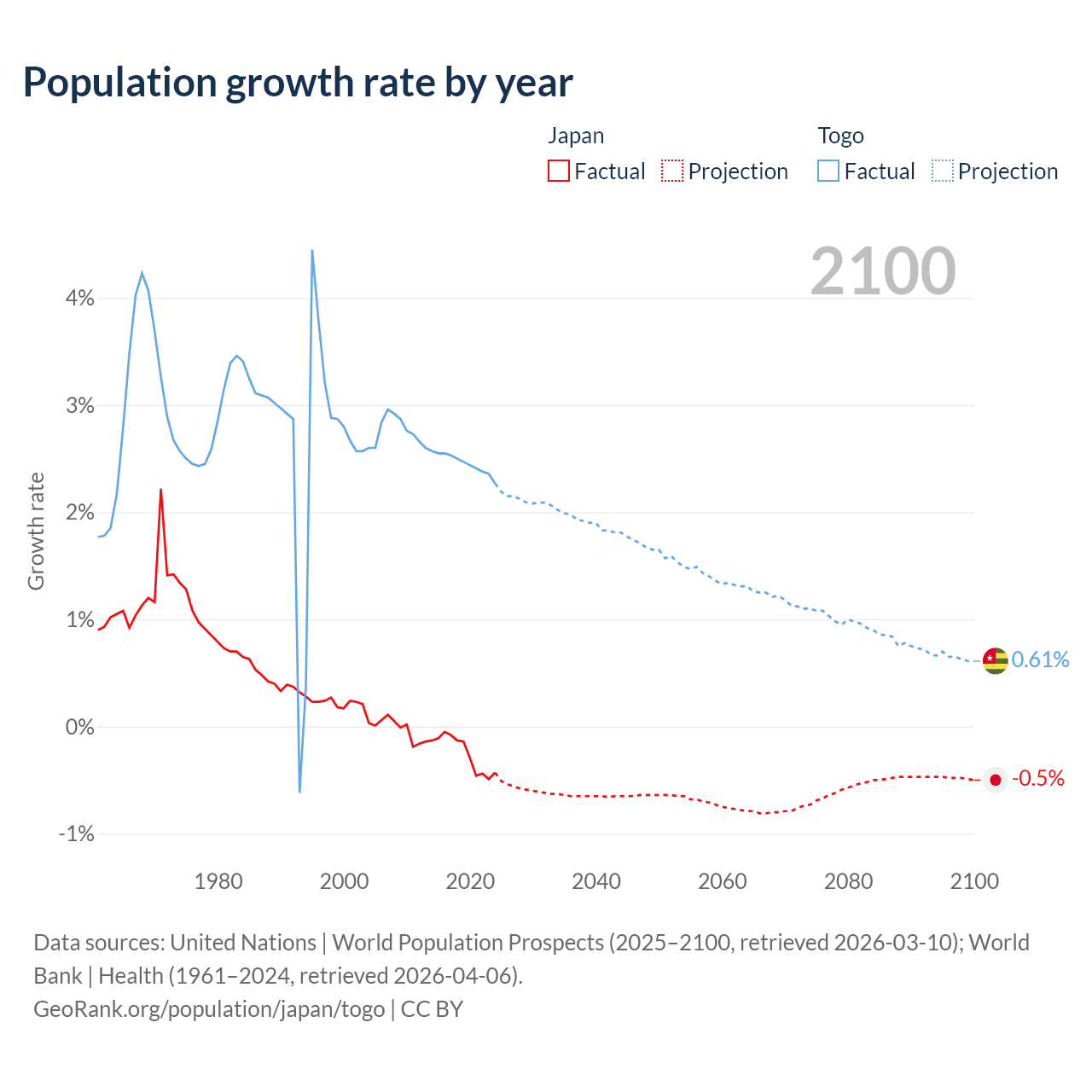 - For the last 10 years, Japan has had an average growth rate of -0.25% per year vs +2.46% in Togo.