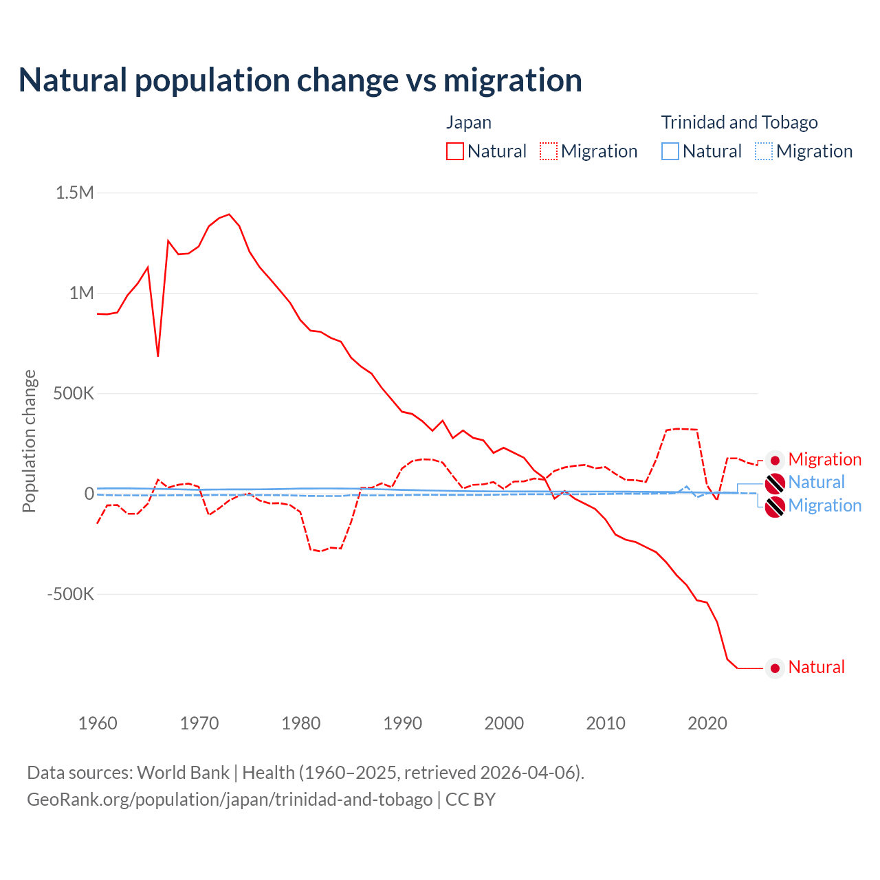Over the last 10 years, 73.6% of the population change in Japan is from natural causes (a loss of 5,178,838 people) and 26.4% is from migration (a gain of 1,860,103 people). In Trinidad and Tobago 66% is from natural causes (a gain of 55,887 people) and 34% is from migration (a gain of 28,785 people).