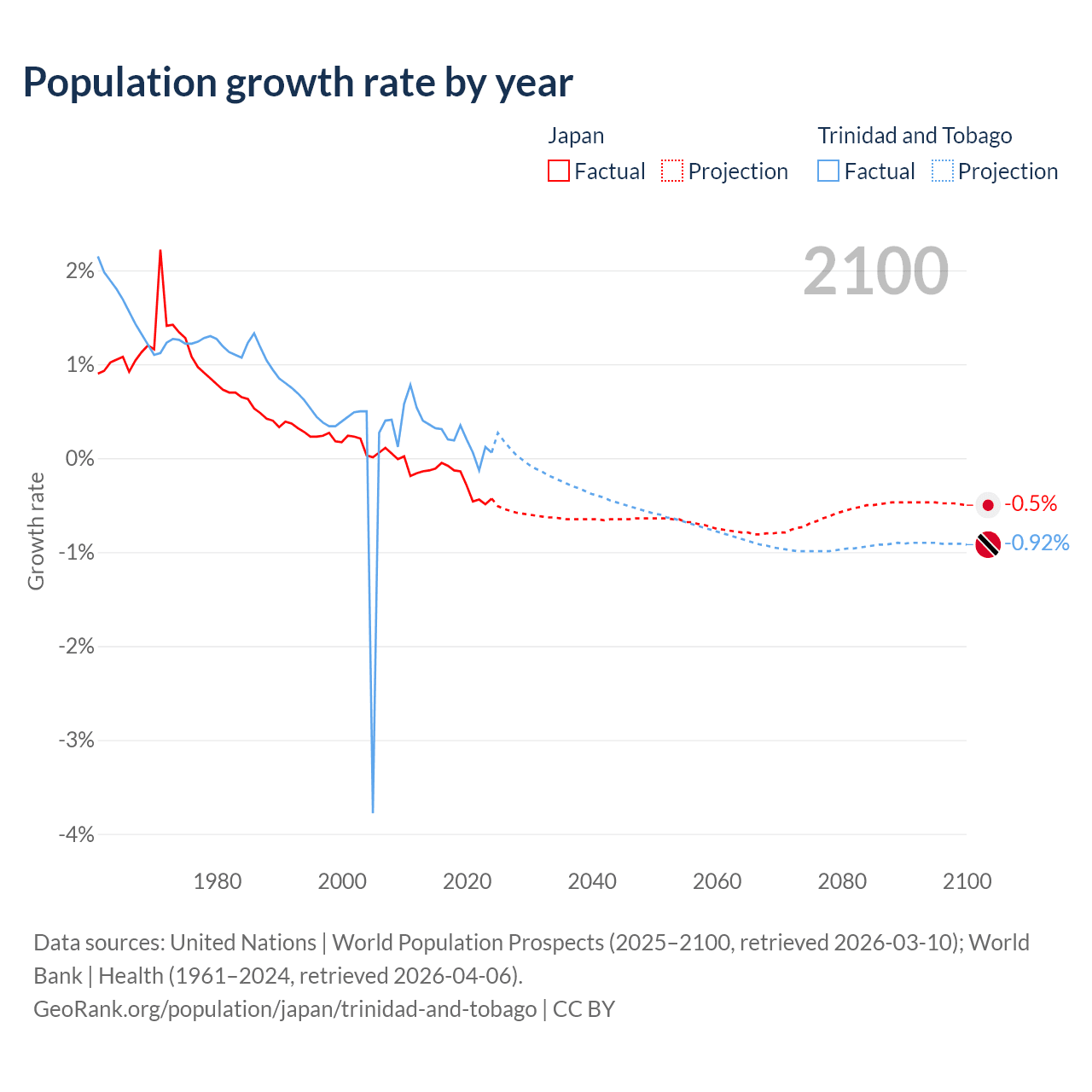 - For the last 10 years, Japan has had an average growth rate of -0.25% per year vs +0.19% in Trinidad and Tobago.