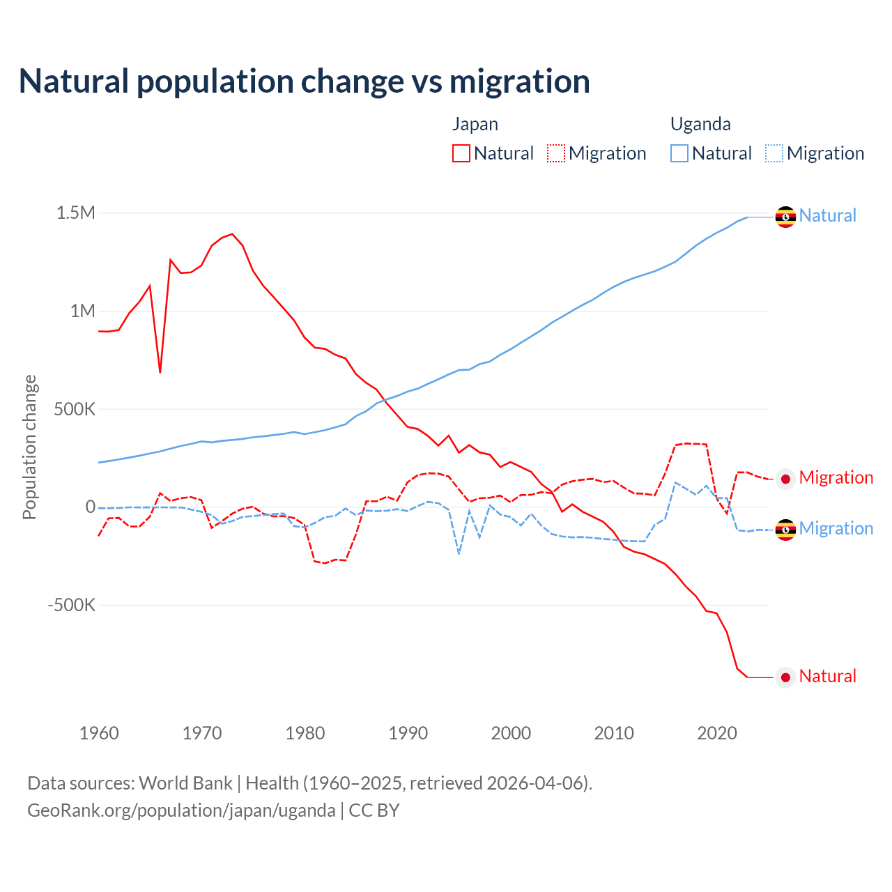 Over the last 10 years, 73.6% of the population change in Japan is from natural causes (a loss of 5,178,838 people) and 26.4% is from migration (a gain of 1,860,103 people). In Uganda 99.5% is from natural causes (a gain of 13,419,712 people) and 0.53% is from migration (a gain of 71,457 people).