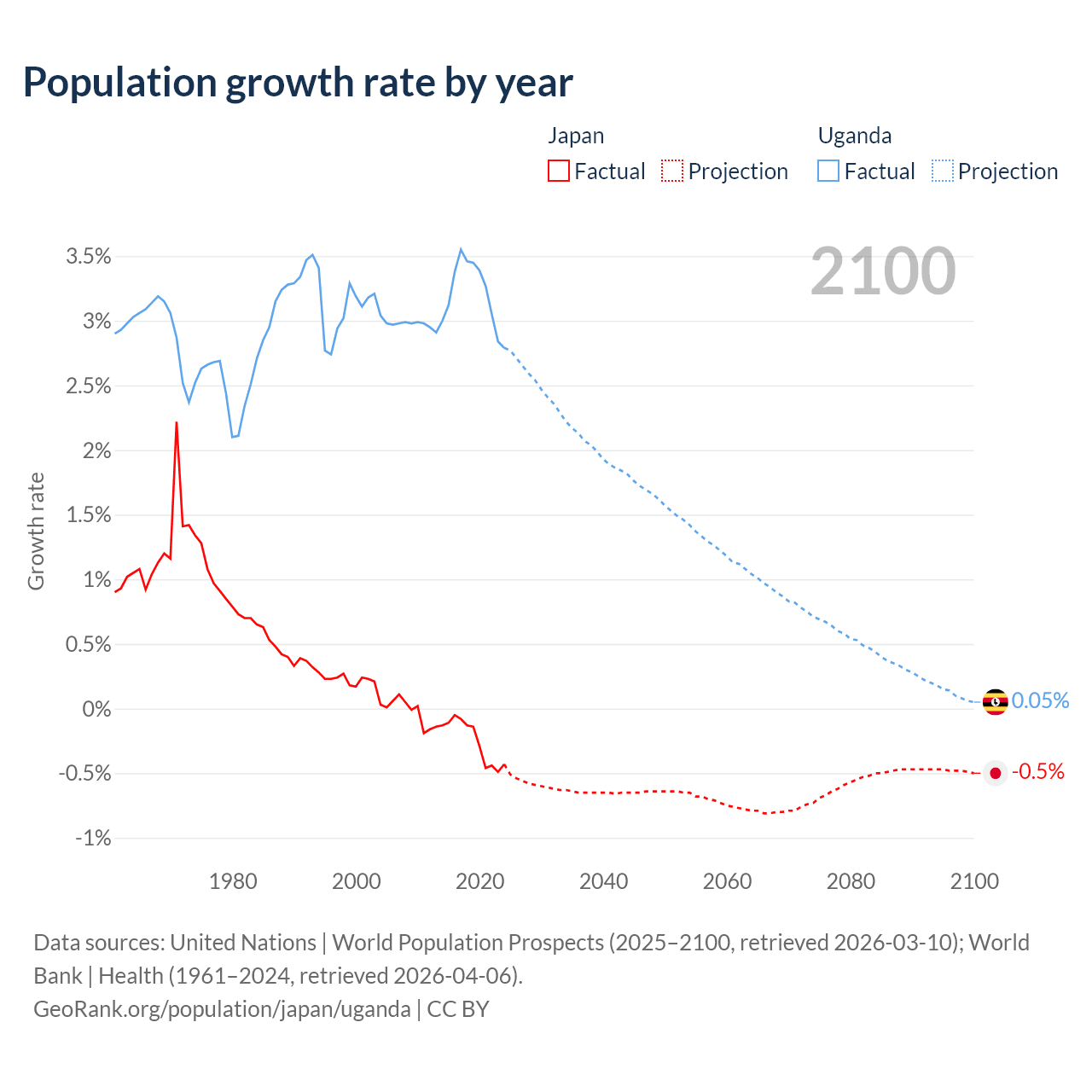 - For the last 10 years, Japan has had an average growth rate of -0.25% per year vs +3.21% in Uganda.