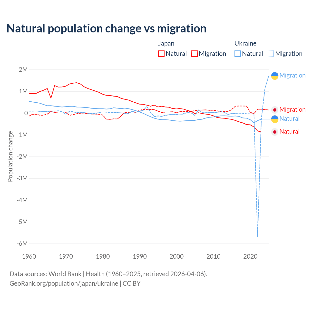 Over the last 10 years, 73.6% of the population change in Japan is from natural causes (a loss of 5,178,838 people) and 26.4% is from migration (a gain of 1,860,103 people). In Ukraine 28.2% is from natural causes (a loss of 2,435,153 people) and 71.8% is from migration (a loss of 6,198,995 people).