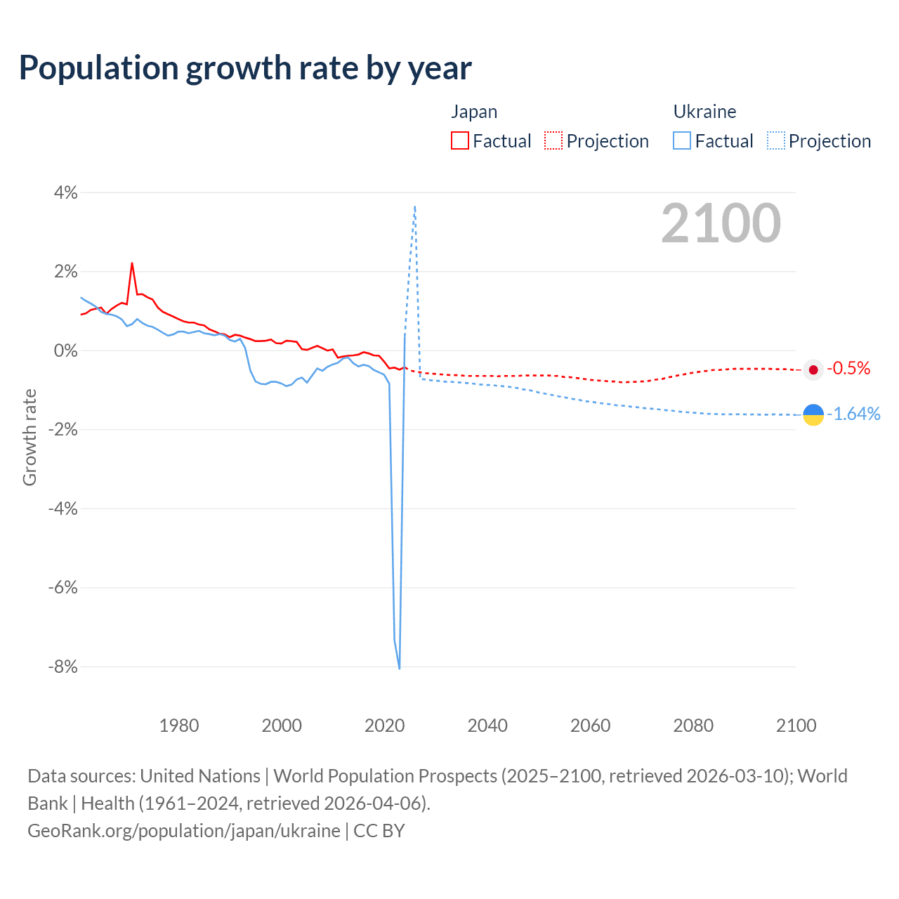 - For the last 10 years, Japan has had an average growth rate of -0.25% per year vs -1.74% in Ukraine.