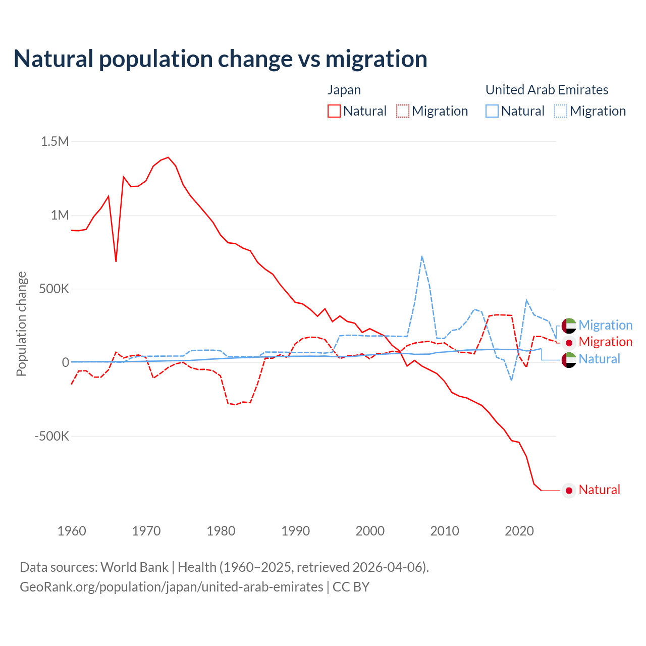Over the last 10 years, 73.6% of the population change in Japan is from natural causes (a loss of 5,178,838 people) and 26.4% is from migration (a gain of 1,860,103 people). In the United Arab Emirates 30.5% is from natural causes (a gain of 857,996 people) and 69.5% is from migration (a gain of 1,958,520 people).