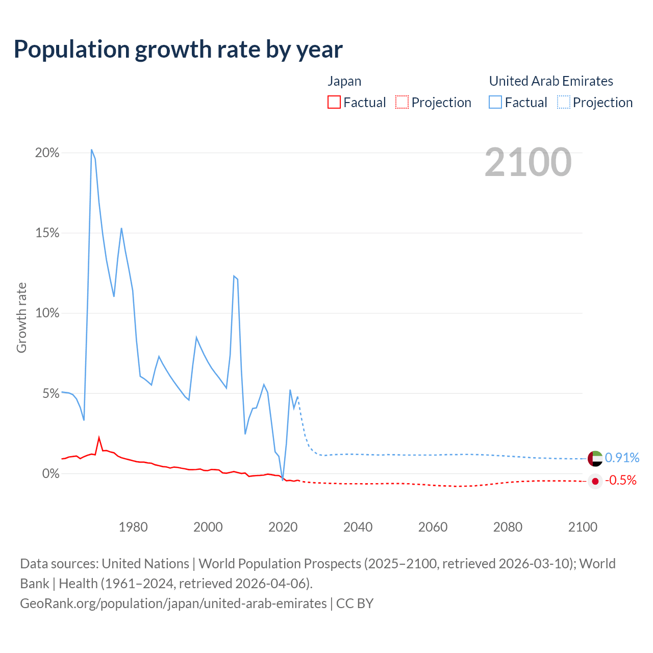 - For the last 10 years, Japan has had an average growth rate of -0.25% per year vs +3.31% in the United Arab Emirates.