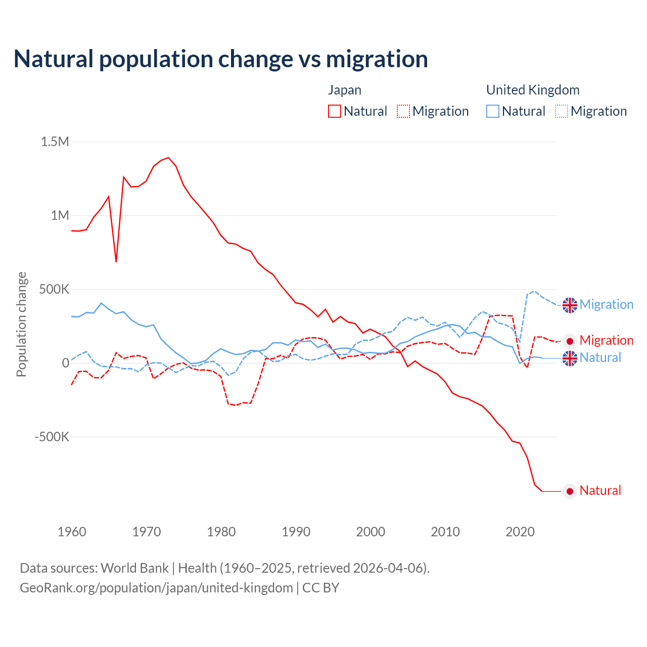 Over the last 10 years, 73.6% of the population change in Japan is from natural causes (a loss of 5,178,838 people) and 26.4% is from migration (a gain of 1,860,103 people). In the United Kingdom 23.9% is from natural causes (a gain of 1,033,129 people) and 76.1% is from migration (a gain of 3,283,101 people).