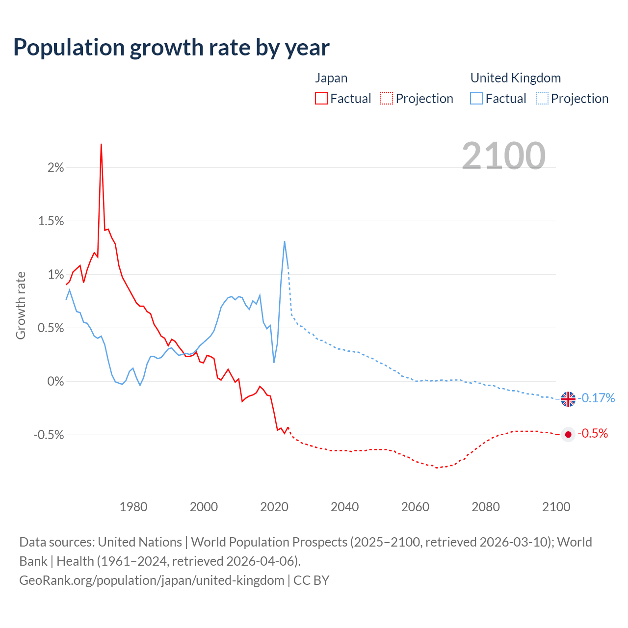 - For the last 10 years, Japan has had an average growth rate of -0.25% per year vs +0.7% in the United Kingdom.