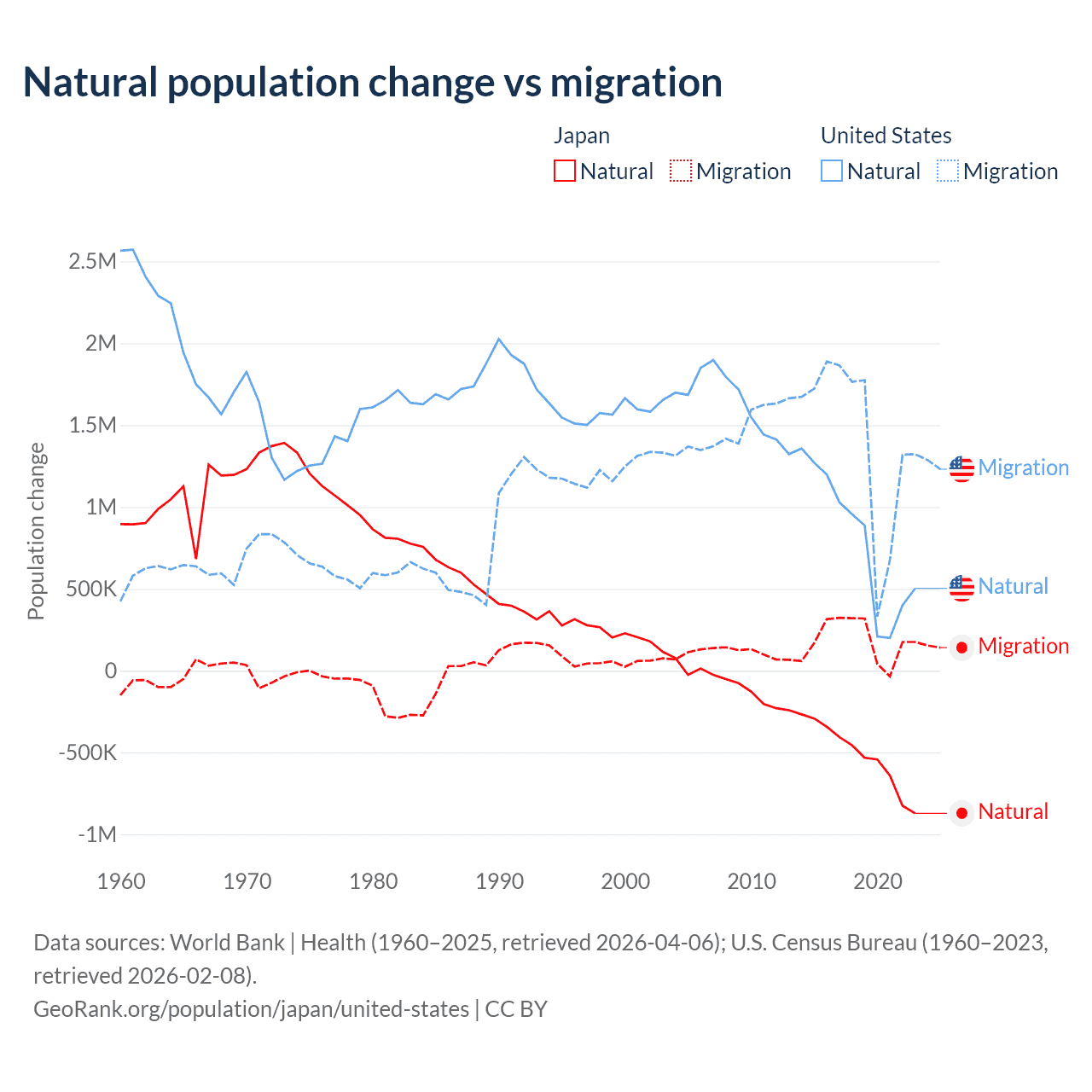 Over the last 10 years, 73.6% of the population change in Japan is from natural causes (a loss of 5,178,838 people) and 26.4% is from migration (a gain of 1,860,103 people). In the United States 35.8% is from natural causes (a gain of 8,005,866 people) and 64.2% is from migration (a gain of 14,334,286 people).