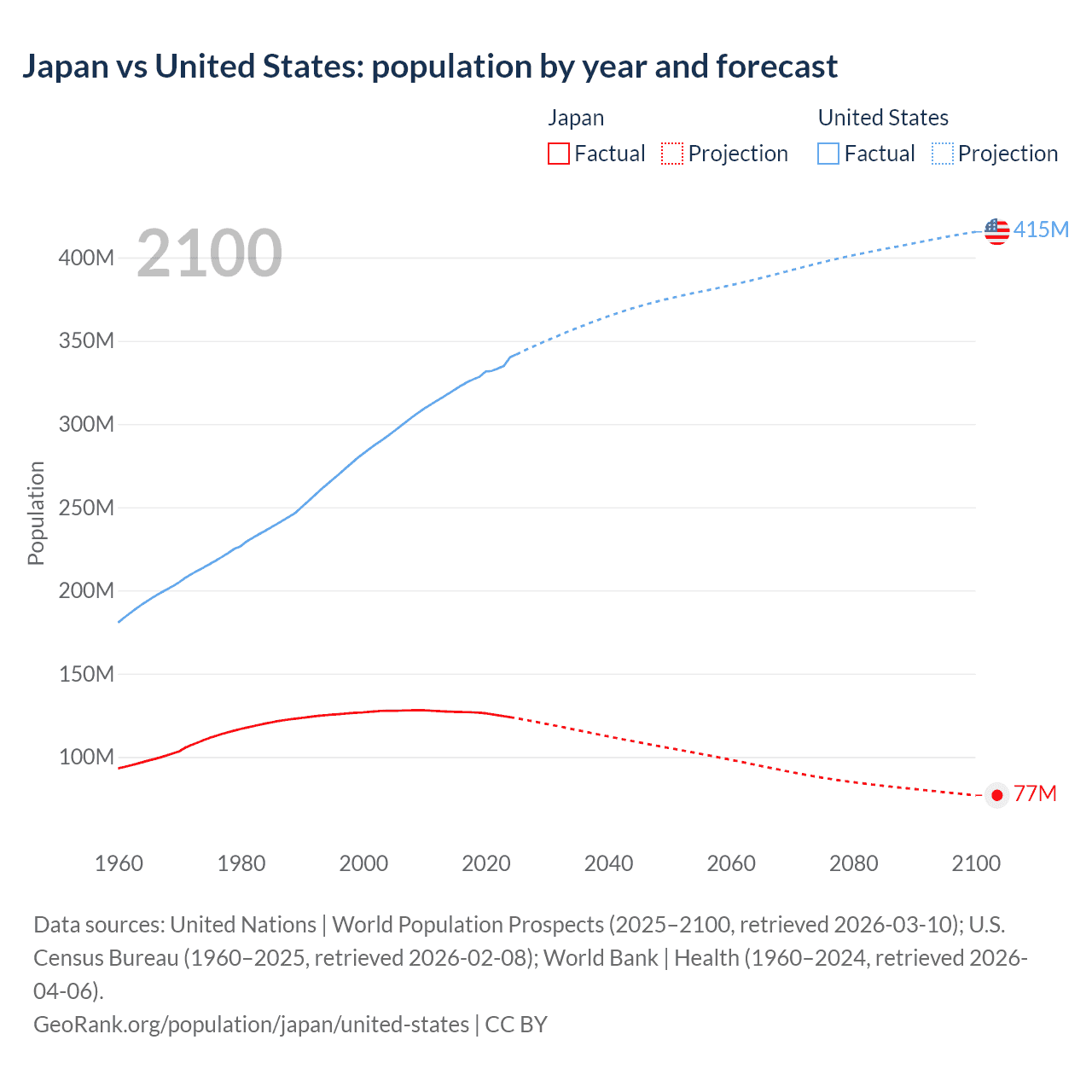 - Since 2006, the population of Japan has decreased from 128M people to 123M (4.05% decline), while the United States has grown from 298M to 344M (15.3% growth).