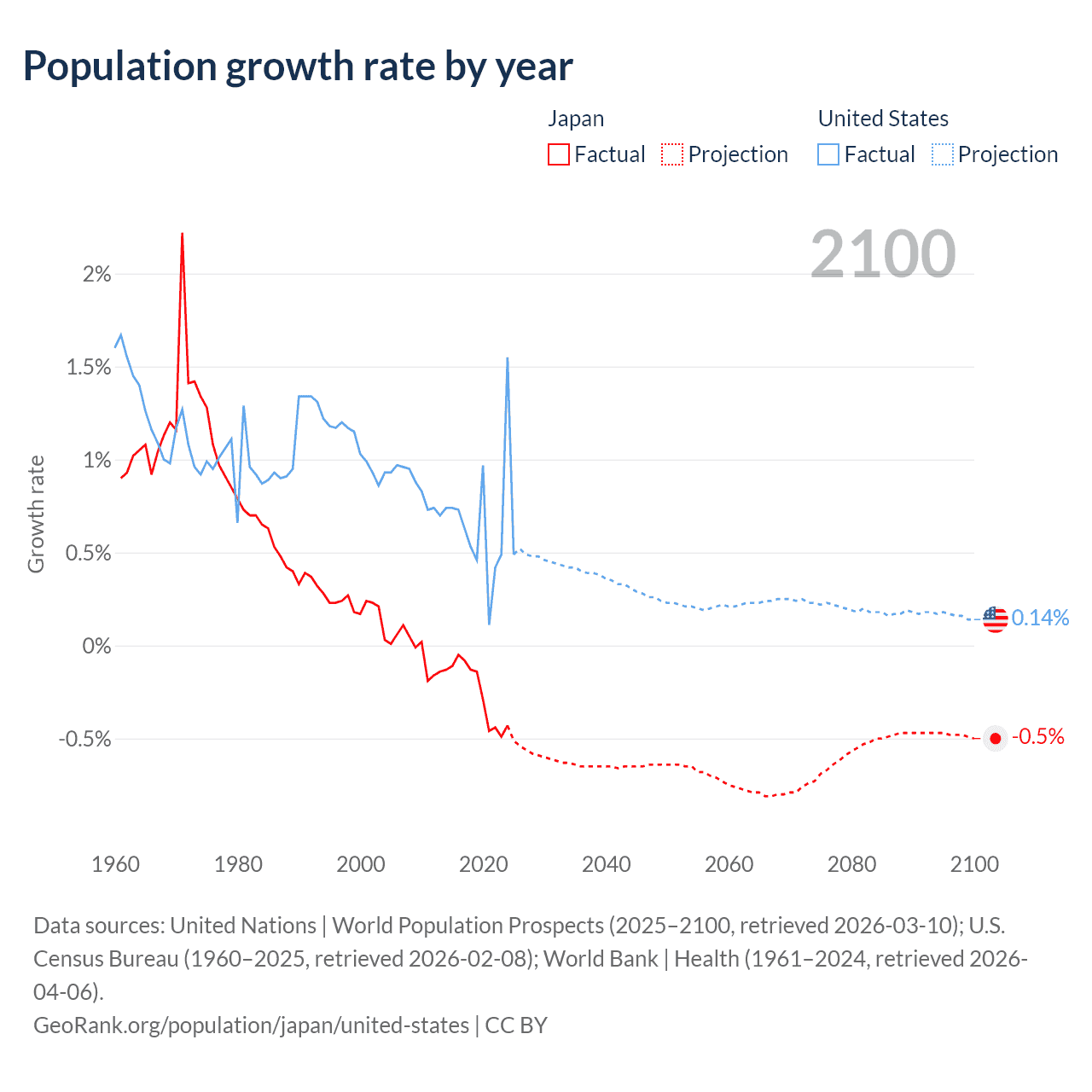 - For the last 10 years, Japan has had an average growth rate of -0.25% per year vs +0.65% in the United States.