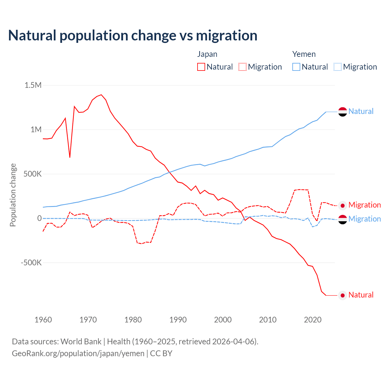 Over the last 10 years, 73.6% of the population change in Japan is from natural causes (a loss of 5,178,838 people) and 26.4% is from migration (a gain of 1,860,103 people). In Yemen 97.8% is from natural causes (a gain of 10,460,813 people) and 2.17% is from migration (a loss of 231,814 people).