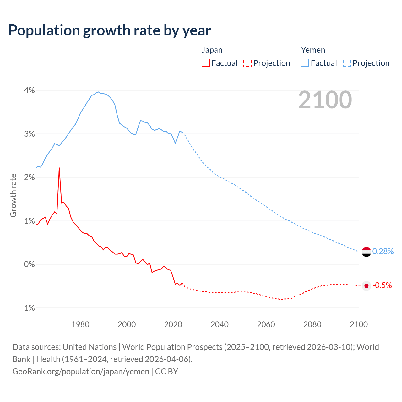 - For the last 10 years, Japan has had an average growth rate of -0.25% per year vs +3% in Yemen.