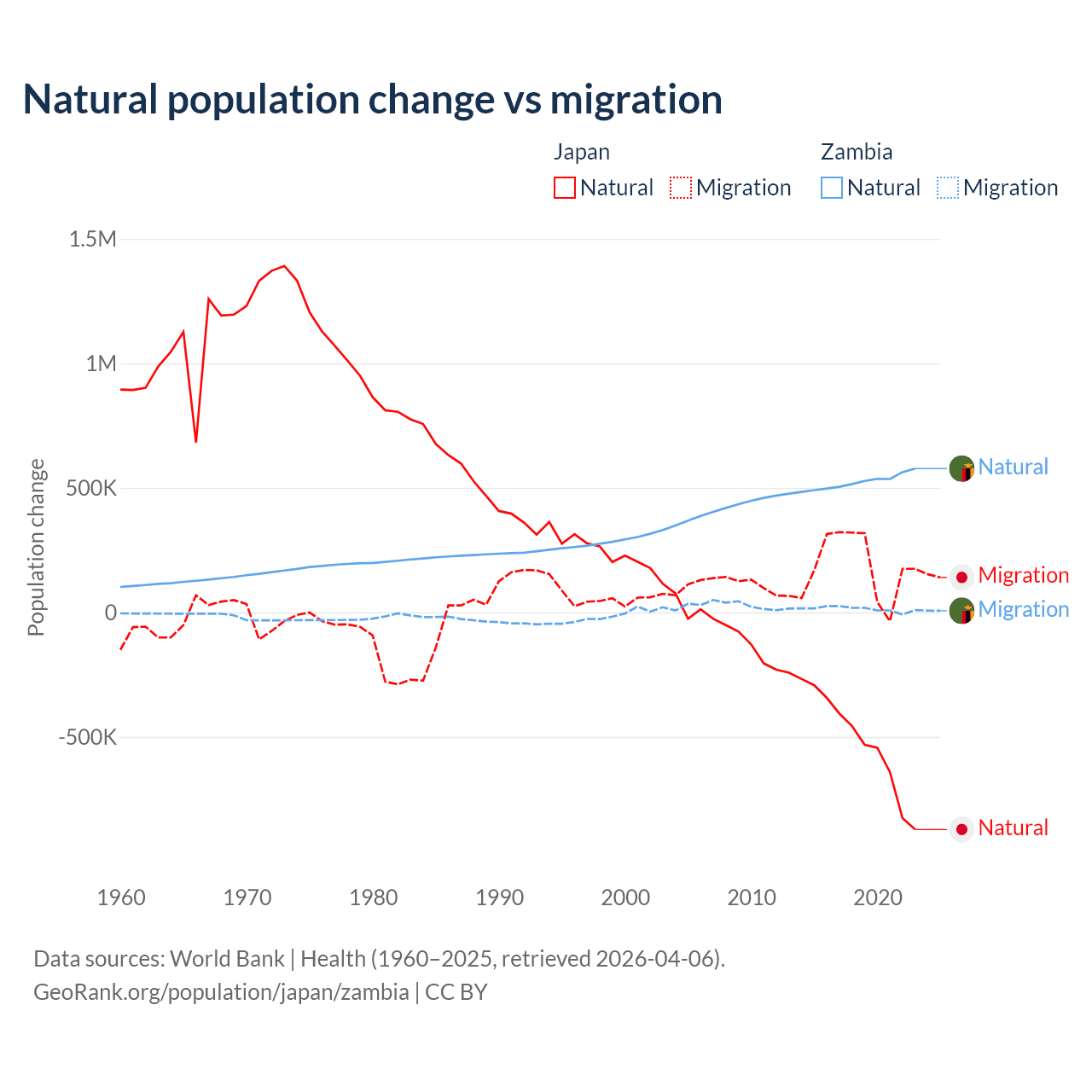 Over the last 10 years, 73.6% of the population change in Japan is from natural causes (a loss of 5,178,838 people) and 26.4% is from migration (a gain of 1,860,103 people). In Zambia 97.4% is from natural causes (a gain of 5,233,797 people) and 2.58% is from migration (a gain of 138,554 people).